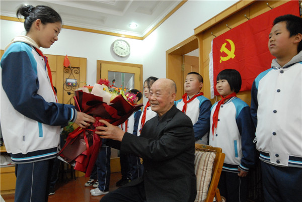 “我當(dāng)兵的時候才13歲,那時候年紀(jì)小……”91歲的傅孝先現(xiàn)在說起那段戰(zhàn)火紛飛的崢嶸歲月,眼睛里依舊閃耀堅毅的光芒?!?月12日,山東省青島市即墨區(qū)環(huán)秀街道興家疃小學(xué)的孩子們帶著鮮花來到山東省青島市即墨區(qū)環(huán)秀街道磨市村91歲的老黨員傅孝先家中,聽老人講述當(dāng)年的革命故事。讓孩子們從老黨員的故事中學(xué)黨史、感黨恩、跟黨走,推動黨史學(xué)習(xí)教育走心、走深、走實。