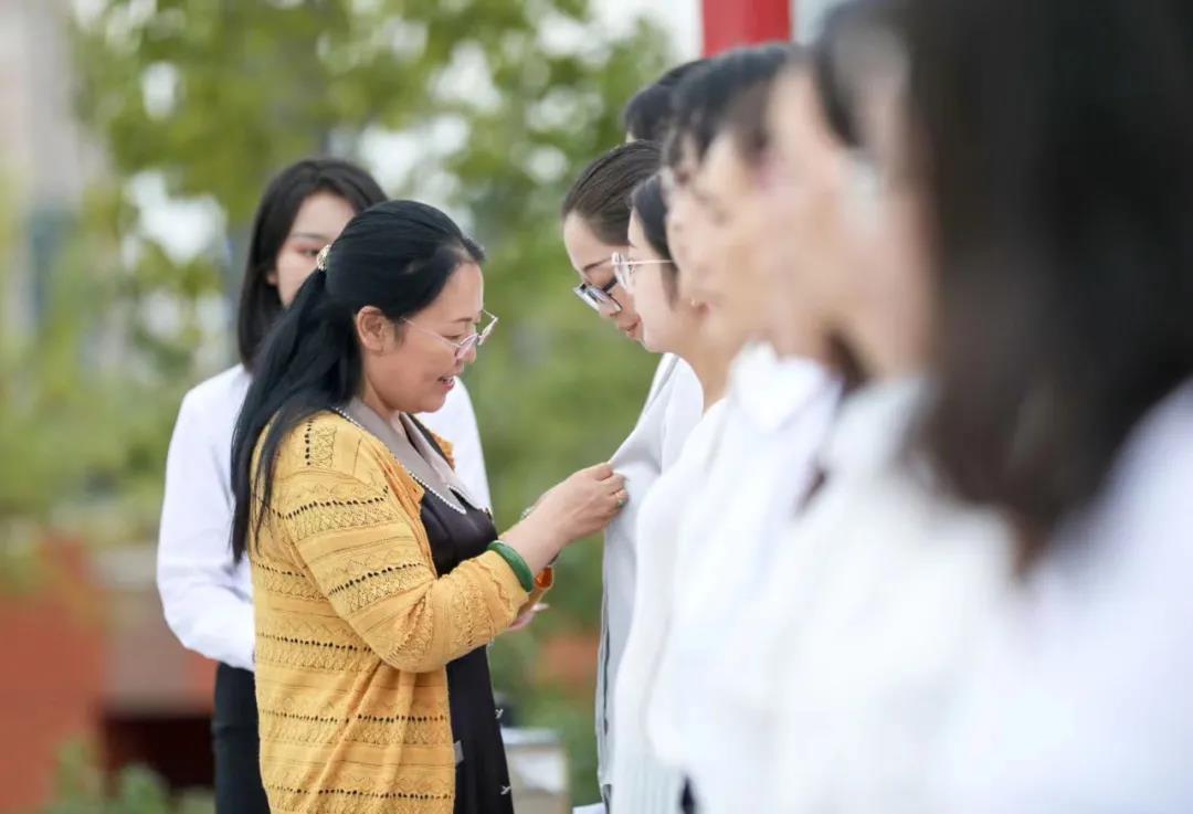 隨后,校黨委副書記、執(zhí)行校長徐愛民,組織部部長黃巖及青島第五屆高校教學名師獲得者莊新穎、單菁華為新進教師佩戴?;铡?/p>