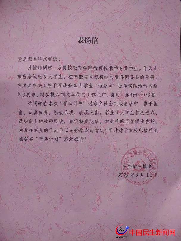 近日,教育學(xué)院收到了來自鄒平團市委的一封感謝信。信中對教育學(xué)院20級位奧楠同學(xué)在社會實習實踐活動中的出色表現(xiàn)表達了感謝之情,以及對恒星學(xué)院的贊美和祝福。近期,青島恒星學(xué)院陸續(xù)收到感謝信,寒假期間,學(xué)生們充分利用這段時光,積極參與社會實踐,處處做文明使者,從而得到社會上的認可和贊譽。