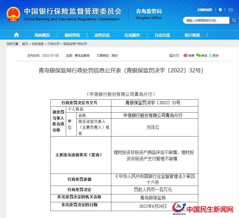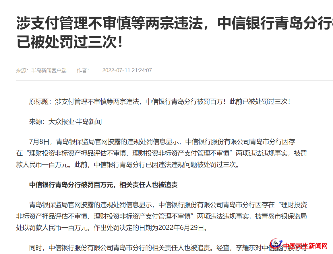 > 中信銀行青島分行被銀保監(jiān)會(huì)處罰100萬
