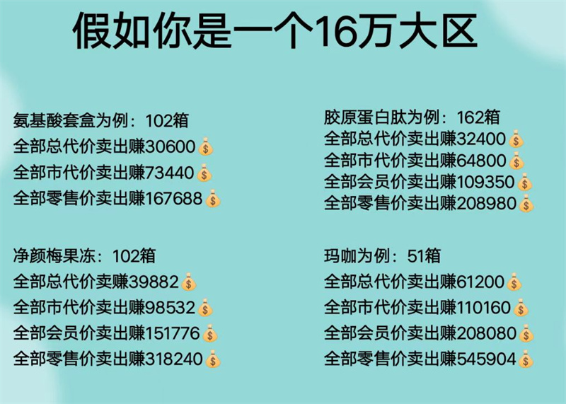 據(jù)經(jīng)銷商介紹,若自己是大區(qū),招到大區(qū),公司就會(huì)下發(fā)平級(jí)返利,不同產(chǎn)品的平級(jí)返利補(bǔ)貼也有所不同。比如蛹蟲草瑪咖片,一盒返利10塊錢,如果自己推薦的大區(qū)拿了一萬盒的瑪咖片,自己能拿到的平級(jí)返利就是十萬元;再比如縱美水光霜,一盒該產(chǎn)品的平級(jí)返利為5塊錢。