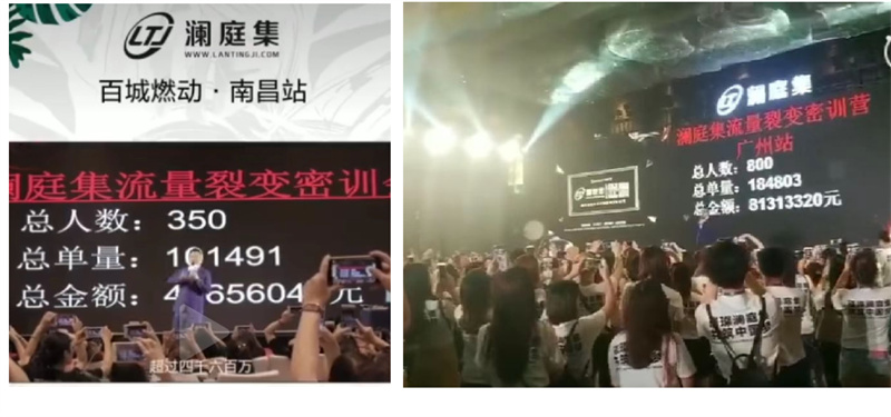 回首最近幾年,瀾庭集在推廣市場(chǎng)這一層面已經(jīng)達(dá)到了相當(dāng)火爆的程度,據(jù)公開資料顯示,在2018年開展的團(tuán)隊(duì)精英裂變密訓(xùn)會(huì)上,瀾庭集的經(jīng)銷商們就拿到了不俗的業(yè)績(jī)。比如南昌站,兩天的時(shí)間內(nèi),350人就創(chuàng)造了四千六百萬的成交額;又比如廣州站,該站再創(chuàng)新高,800人成交了八千多萬的業(yè)績(jī)。