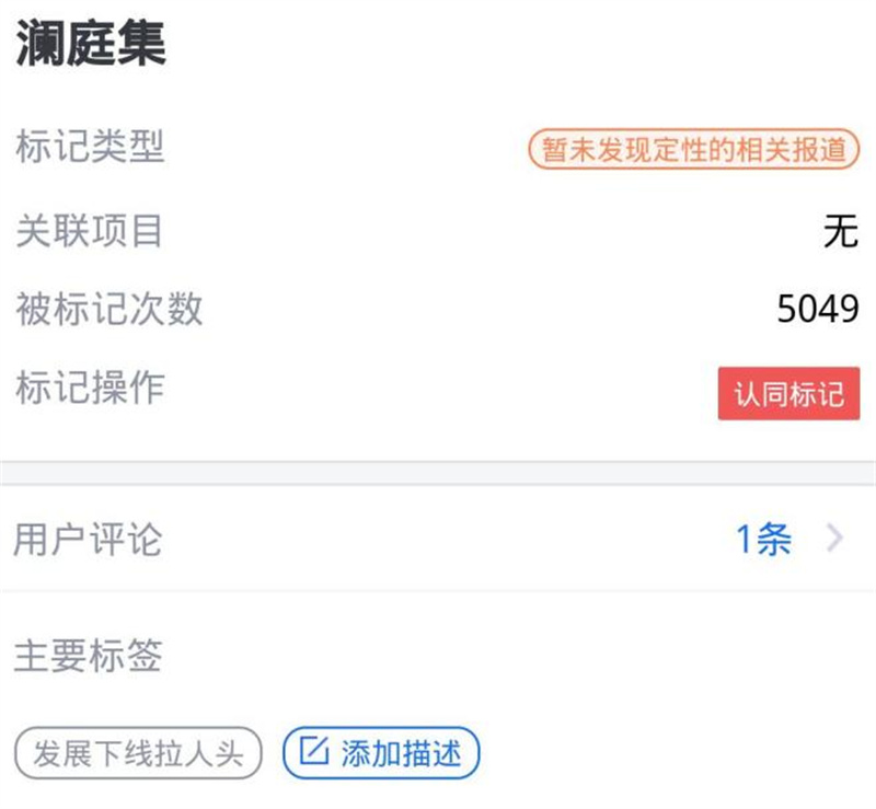 眼下,在騰訊靈鯤金融風(fēng)險(xiǎn)監(jiān)管平臺(tái)上,“瀾庭集”這個(gè)關(guān)鍵詞已經(jīng)被標(biāo)記了5049次,雖然標(biāo)記類型是“暫未發(fā)現(xiàn)定性的相關(guān)報(bào)道”,但其主要標(biāo)簽有“發(fā)展下線拉人頭”的字樣。