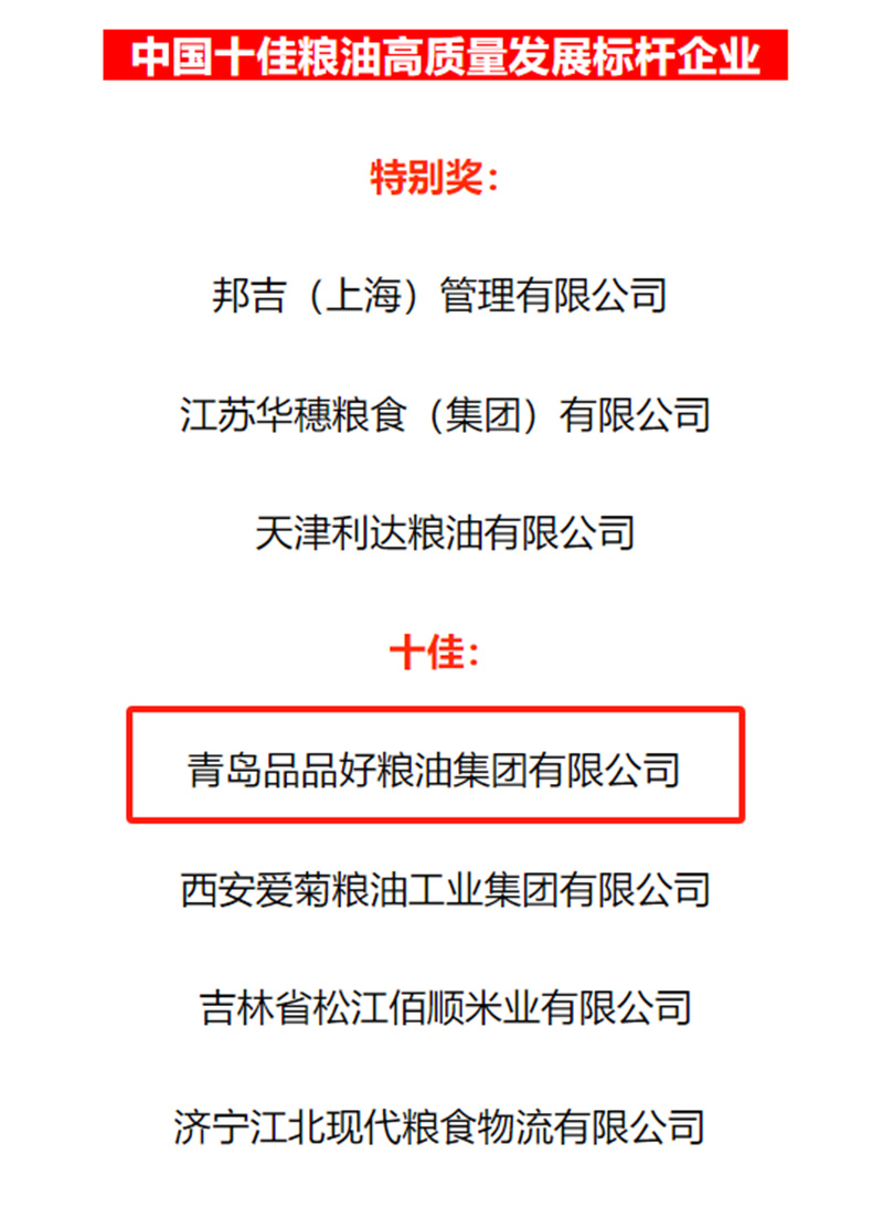 近日,第十四屆中國(guó)糧油榜正式開榜。青島品品好糧油集團(tuán)有限公司憑借多年來卓越的表現(xiàn),榮獲了“中國(guó)十佳糧油高質(zhì)量發(fā)展標(biāo)桿企業(yè)”的殊榮。