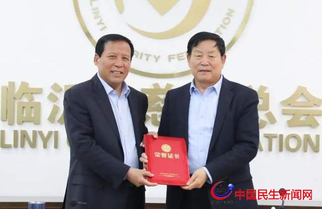 臨沂市慈善總會會長徐福田(左)向天基集團董事長黃金山(右)授予榮譽證書