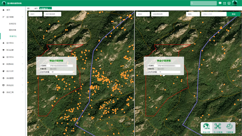 “空天地”一體化的創(chuàng)新監(jiān)測模式使松材線蟲病的普查區(qū)域全面性、預警時效性、監(jiān)測準確性和除治科學性大大增強,減少了所需人力物力的投入,并且可以將松材線蟲病的監(jiān)測預警精確到株,在衛(wèi)星影像上進行空間化展示和標記,對“病枯死松樹數量”“病枯死松樹位置”“除治進度”“成效核查”等指標進行科學化監(jiān)測、精細化管理和智能化分析,有利于管理部門宏觀快速地了解各個疫點疫情發(fā)生態(tài)勢和危害程度,進一步提高了松材線蟲病防控工作和疫情評估的科學性,為松材線蟲病防治提供準確的數據依據。