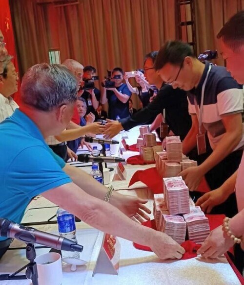 2019年,李士杰組織的首屆“中國書法大廈杯”頒獎(jiǎng)現(xiàn)場(chǎng),以巨額現(xiàn)金進(jìn)行發(fā)放
