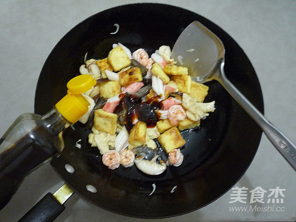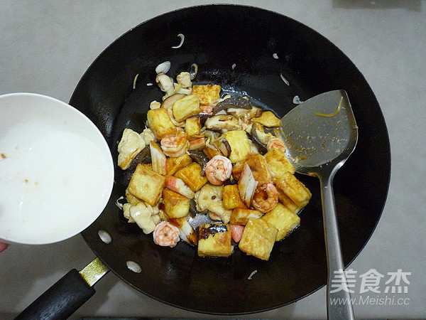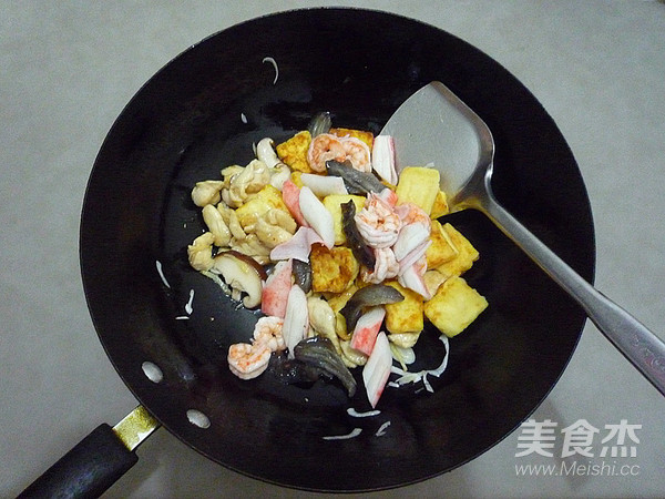 10.炒出香味后,放入炸好的豆腐、滑炒好的雞肉、焯過水的海參、蝦仁、蟹肉棒等食材。