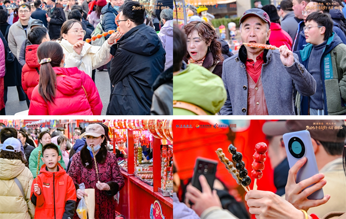 現(xiàn)場(chǎng),形態(tài)各異的糖球讓人目不暇接。經(jīng)典的山楂糖球酸甜開(kāi)胃,黑棗糖球軟糯醇香,還有裹滿(mǎn)芝麻的花式糖球,每一款都獨(dú)具風(fēng)味。市民游客手持糖球,或駐足品嘗,或拍照打卡,清脆的“嘎嘣”聲此起彼伏。年輕人舉著手機(jī)記錄美味瞬間,長(zhǎng)輩帶著孩子體驗(yàn)傳統(tǒng)年味,情侶互相投喂糖球,溫馨的畫(huà)面在會(huì)場(chǎng)隨處可見(jiàn)。