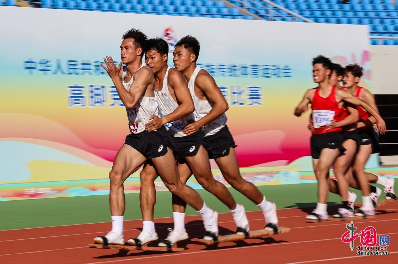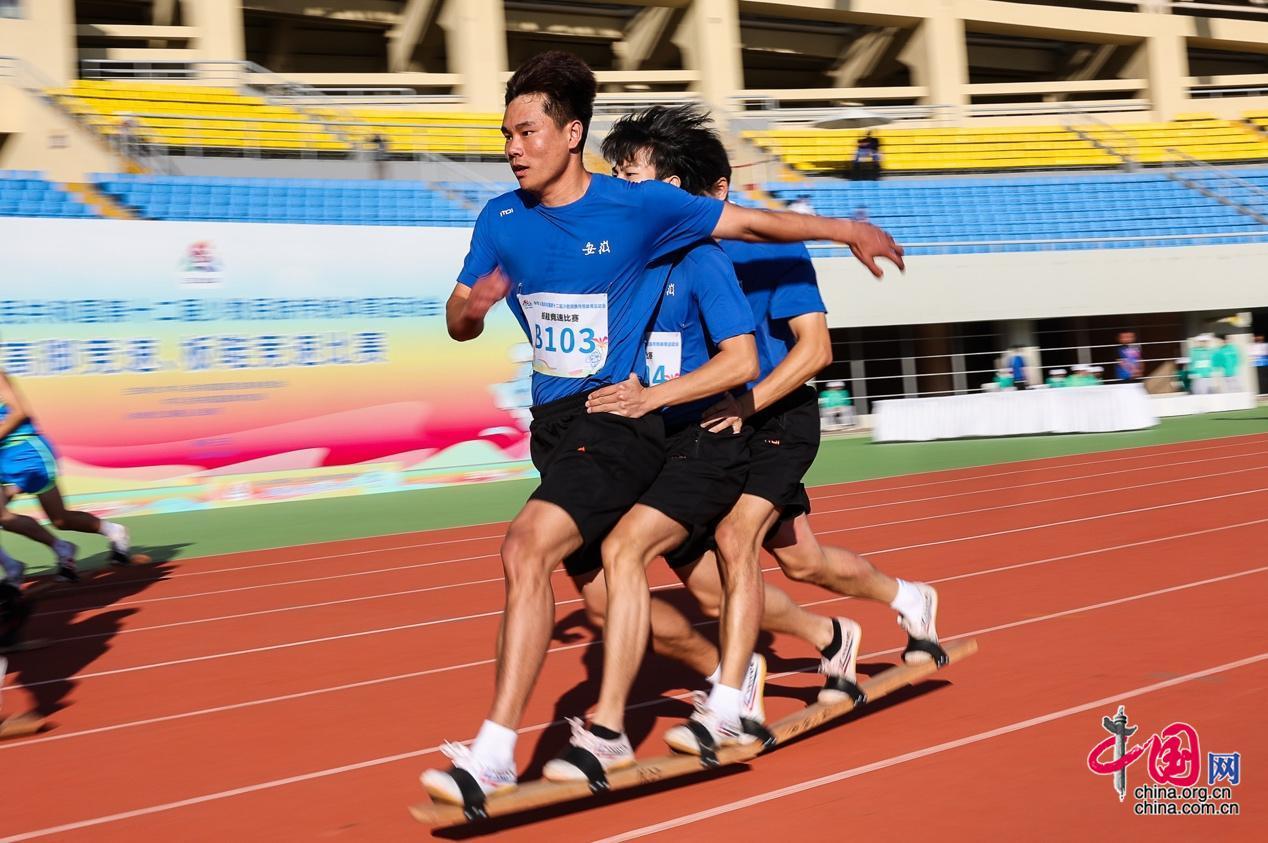 11月28日,第十二屆全國少數(shù)民族傳統(tǒng)體育運動會板鞋競速比賽男子三人板鞋項目在海南省三亞技師學(xué)院體育場舉行。中國網(wǎng)記者 董寧 攝影
