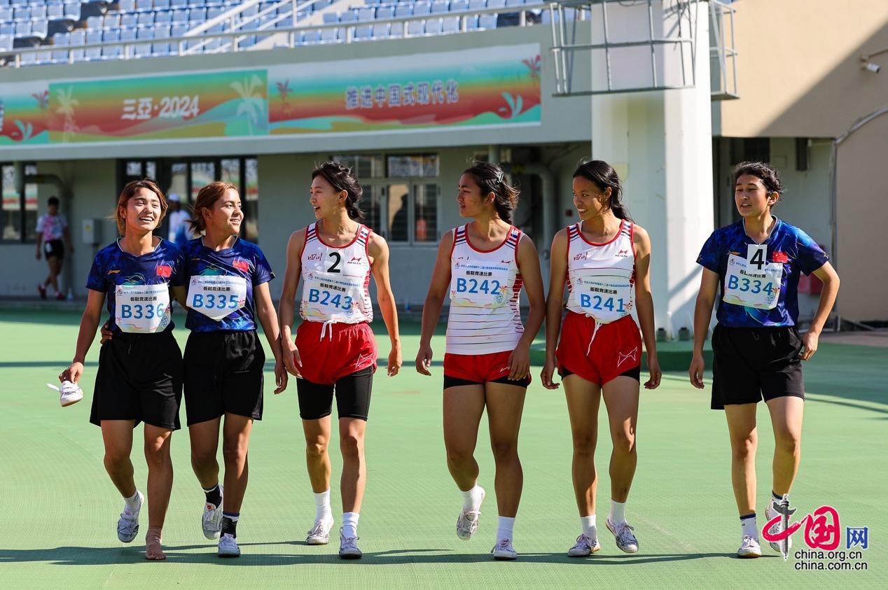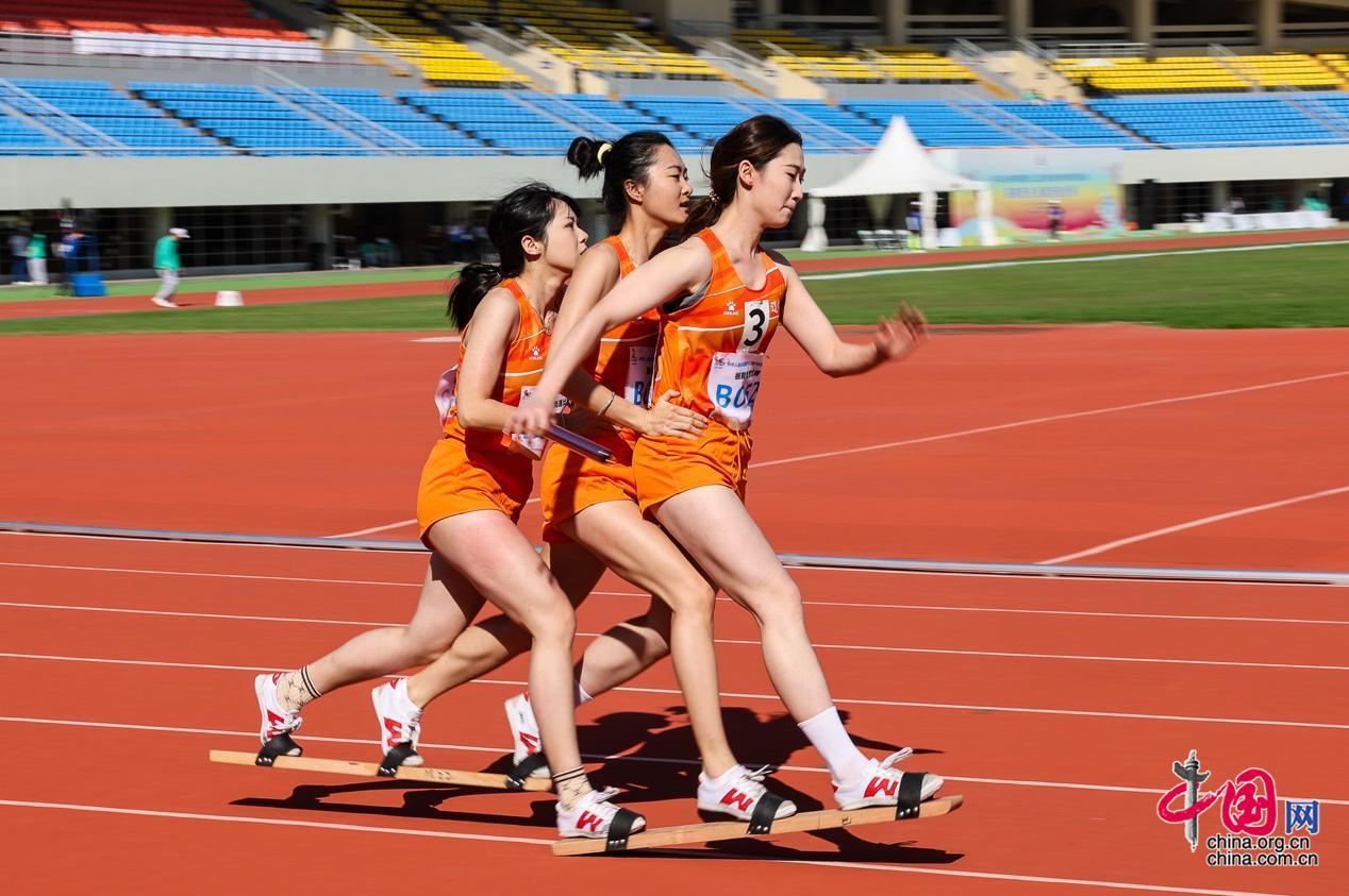 11月28日,第十二屆全國少數(shù)民族傳統(tǒng)體育運動會板鞋競速比賽女子三人板鞋項目在海南省三亞技師學(xué)院體育場舉行。中國網(wǎng)記者 董寧 攝影