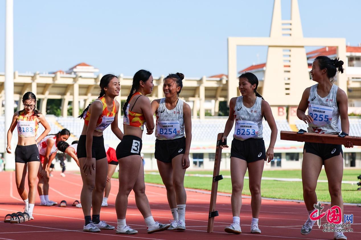 11月28日,第十二屆全國少數(shù)民族傳統(tǒng)體育運動會板鞋競速比賽女子三人板鞋項目在海南省三亞技師學(xué)院體育場舉行。圖為湖南代表團選手和貴州代表團選手賽后相互祝賀。中國網(wǎng)記者 董寧 攝影