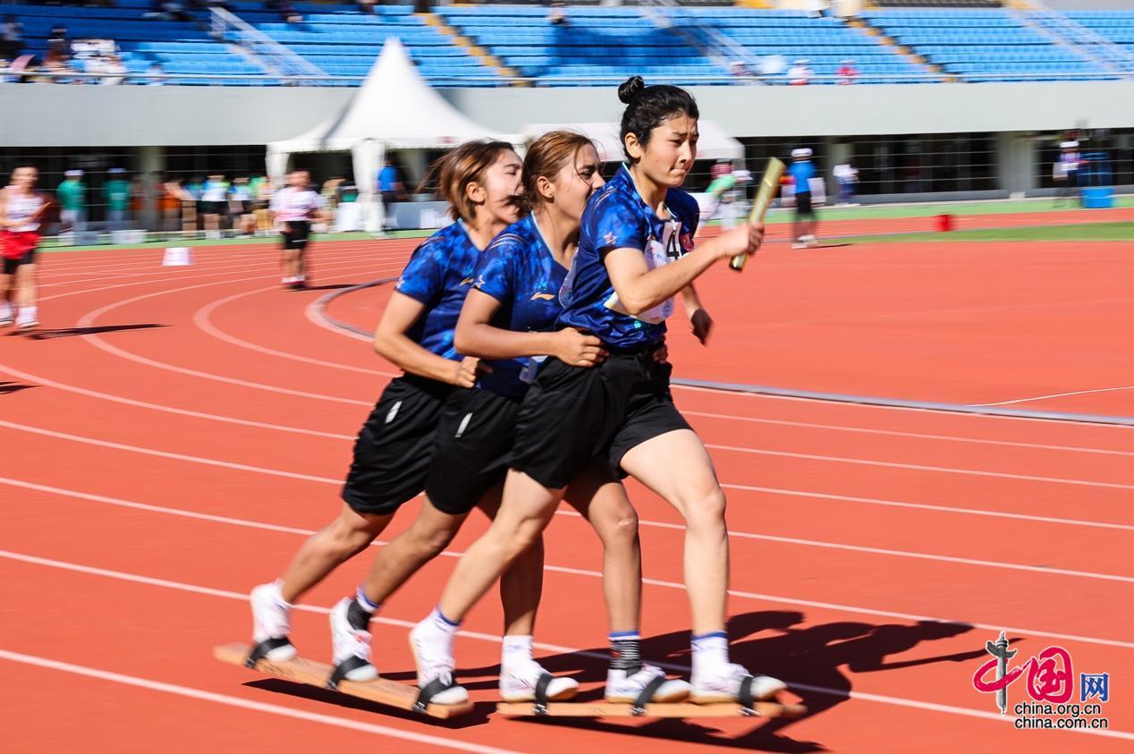 11月28日,第十二屆全國少數(shù)民族傳統(tǒng)體育運動會板鞋競速比賽三人板鞋混合接力板鞋項目在海南省三亞技師學(xué)院體育場舉行。中國網(wǎng)記者 董寧 攝影