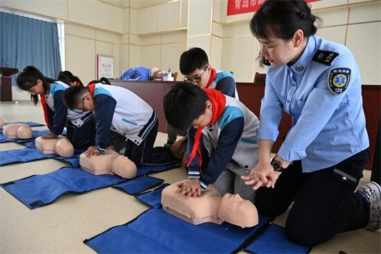 “在實踐操作環(huán)節(jié)中,背挺直,手臂繃直,用腰部的力氣按壓兩點正中位置,按壓深度5—6cm,保持頻率,按壓30次……”為普及應(yīng)急救護知識,提高廣大師生應(yīng)對突發(fā)事件和意外傷害的自救互救能力,5月8日,青島市即墨區(qū)120急救中心組織開展應(yīng)急救護普及培訓(xùn)活動,醫(yī)護人員走進即墨區(qū)數(shù)字裝備園實驗小學(xué),手把手指導(dǎo)學(xué)生們進行急救方式練習(xí)并掌握操作要領(lǐng)。“正確的心臟按壓部位是雙乳頭連線中點處,按壓力度為胸廓下壓約5至6厘米。進行人工呼吸前需要檢查口部有無異物……”即墨區(qū)120急救中心醫(yī)護人員白琳說。