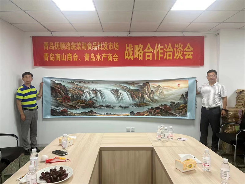 牟磊總經(jīng)理對兩商會一行說:南山市場是百年市場,在民國時期就享有盛名,尤為經(jīng)四十年的改革開放,為島城及周邊地區(qū)的餐飲業(yè)供求發(fā)展做出了巨大貢獻。希望通過今天的本次活動,加深雙方對接,打開雙方融合發(fā)展的大門,優(yōu)勢互補開啟雙方尋求合作機遇,為加快國際化大都市及島城市民的菜籃子貢獻力量!
