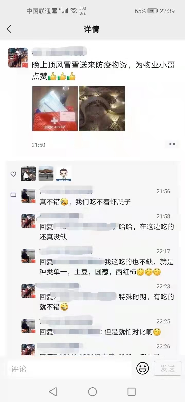 疫情發(fā)生后,山東各地的龍湖項(xiàng)目第一時(shí)間啟動(dòng)防控應(yīng)急預(yù)案,各項(xiàng)目成立防疫專項(xiàng)工作小組,開啟全天候隨叫隨到服務(wù)。全天候協(xié)助社區(qū)核酸檢測(cè),幫業(yè)主代買肉菜等生活必需品并送貨上門;為學(xué)生免費(fèi)打印學(xué)習(xí)資料;幫未入住/未在家的業(yè)主開窗關(guān)窗、澆花、照顧寵物;幫業(yè)主代充水費(fèi)和燃?xì)赓M(fèi);接送行動(dòng)不便的老人出門做核酸等等。