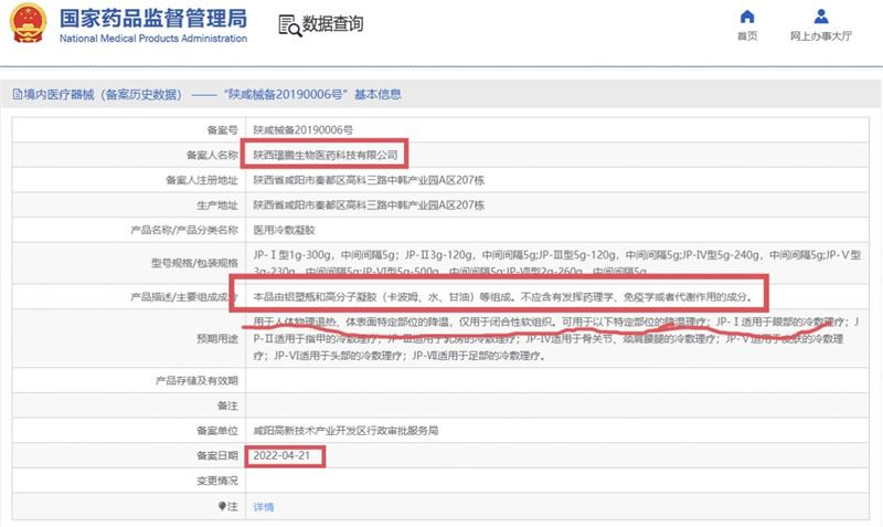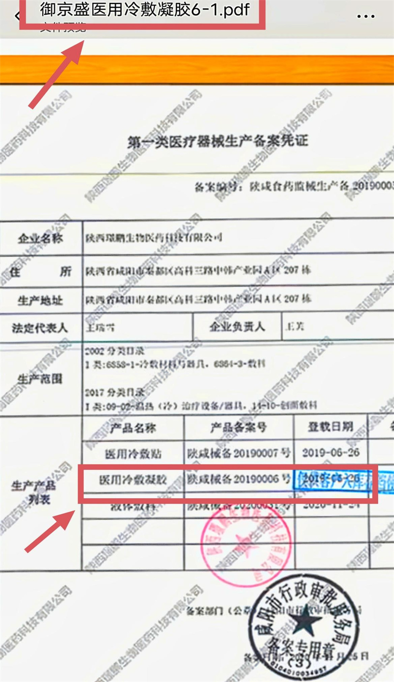 由代理提供的產(chǎn)品備案信息可看到,“御京盛·醫(yī)用冷敷凝膠”的產(chǎn)品備案號為:陜咸械備20190006號。在國家藥品監(jiān)督管理局官網(wǎng)查詢該備案號得到的信息是,該產(chǎn)品的備案人是陜西璟鵬生物醫(yī)藥科技有限公司,備案日期是2022年4月21日,也就是說,該產(chǎn)品是陜西璟鵬生物醫(yī)藥科技有限公司代加工生產(chǎn)的。并且,該產(chǎn)品屬于第一類醫(yī)療器械,由鋁塑瓶和高分子凝膠(卡波姆、水、甘油)等組成,不應含有發(fā)揮藥理學、免疫學或者代謝作用的成分。用于人體物理退熱、體表面特定部位的降溫,僅用于閉合性軟組織,適用于眼部的冷敷理療。由此可見,“御京盛·醫(yī)用冷敷凝膠”并不具備其所宣傳的治療各種眼疾、近視的效果,其有關宣傳材料明顯存在醫(yī)療器械廣告宣傳的功能主治、適用范圍超出了批準的內容,含有不科學地表示功效的斷言和保證,嚴重欺騙和誤導消費者。