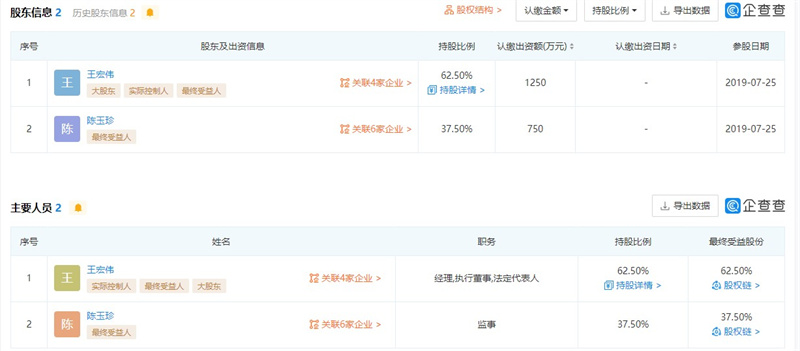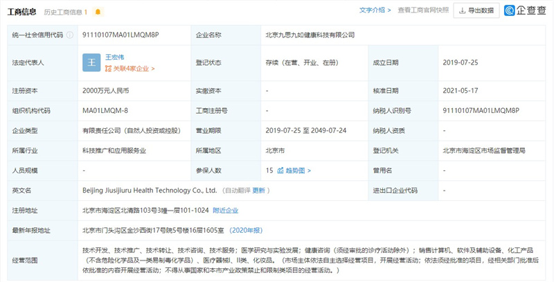 北京九思九如健康科技有限公司成立于2019年7月25日,注冊地位于北京市海淀區(qū)北清路103號3幢一層,注冊資本為2000萬元,法定代表人為王某偉。該公司由王某偉控股62.5%并擔任執(zhí)行董事兼總經(jīng)理,陳某珍持股37.5%并擔任監(jiān)事。王某偉是該公司的實際控制人盒最終受益人。