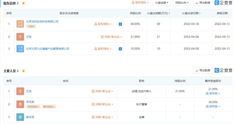 企查查APP顯示,北京住邦健康管理有限公司成立于2022年4月13日,注冊地位于北京市石景山區(qū)西井路19號院3號樓,注冊資本為100萬元,法定代表人為王某。王某擔任該公司總經(jīng)理,龍某宜擔任執(zhí)行董事,袁某高擔任監(jiān)事。該公司由北京住邦生物科技有限公司控股69%,北京九思九如健康產(chǎn)業(yè)管理有限公司持股10%,王某持股21%。北京九思九如健康產(chǎn)業(yè)管理有限公司便是九思九如集團旗下公司之一。