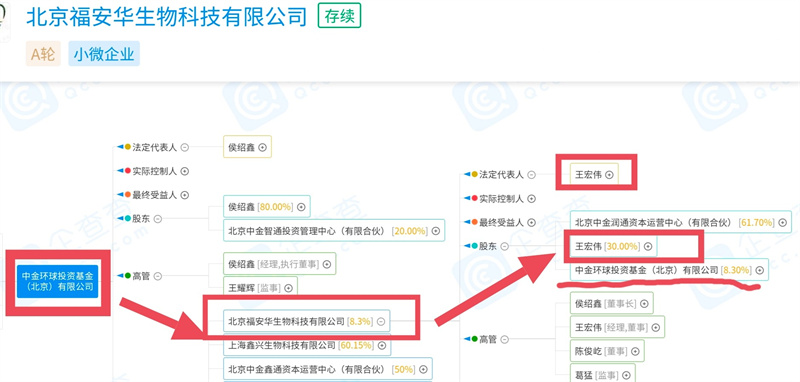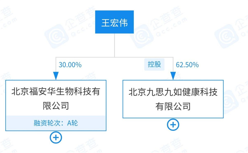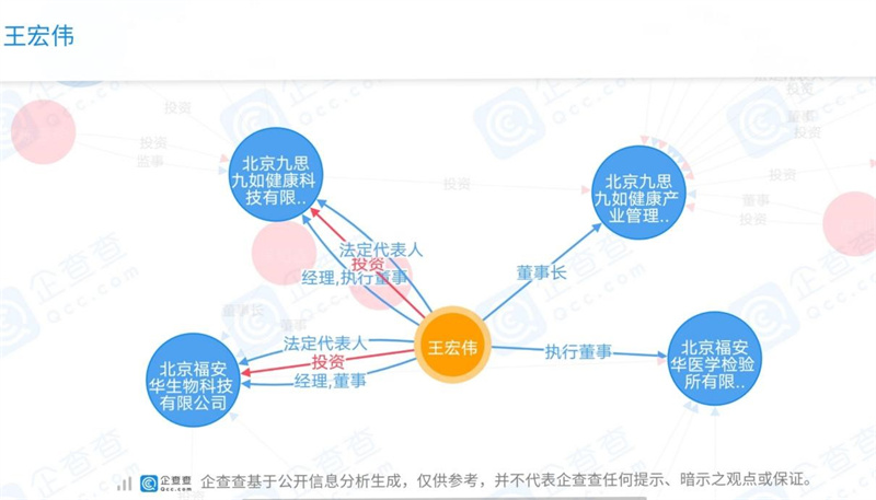 調查者從代理處獲悉,王某偉就是住邦生物科技的創(chuàng)始人。企查查APP顯示,王某偉與四家公司有關聯(lián),他不僅是北京九思九如健康科技有限公司董事長,還對外投資了北京福安華生物科技有限公司,持股30%并擔任該公司法定代表人、執(zhí)行董事兼總經(jīng)理;擔任北京九思九如健康產(chǎn)業(yè)管理有限公司董事長;擔任北京福安華醫(yī)學檢驗所有限公司執(zhí)行董事。此外,王某偉還是中金環(huán)球投資基金集團的核心成員。