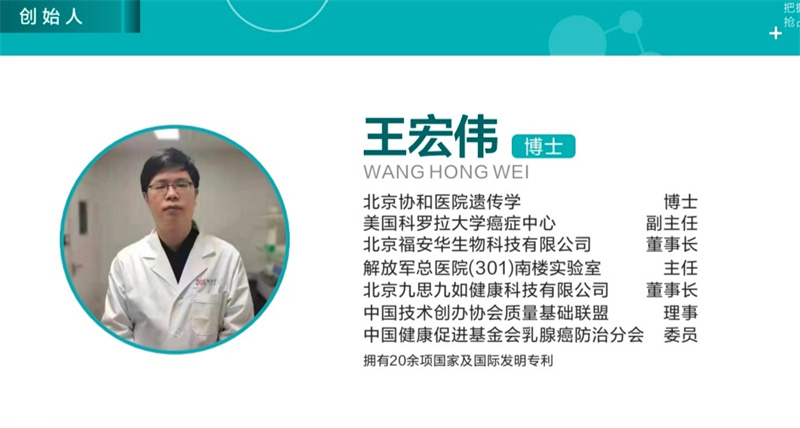 據(jù)代理宣傳,王某偉身上具有多重光環(huán)。他不僅是北京某醫(yī)院遺傳學博士,還是美國科羅拉大學癌癥中心副主任、某總醫(yī)院(301)南樓實驗室主任、中國技術創(chuàng)辦協(xié)會質量基礎聯(lián)盟理事、中國健康促進基金會乳腺癌防治分會委員,擁有20余項國家及國際發(fā)明專利。