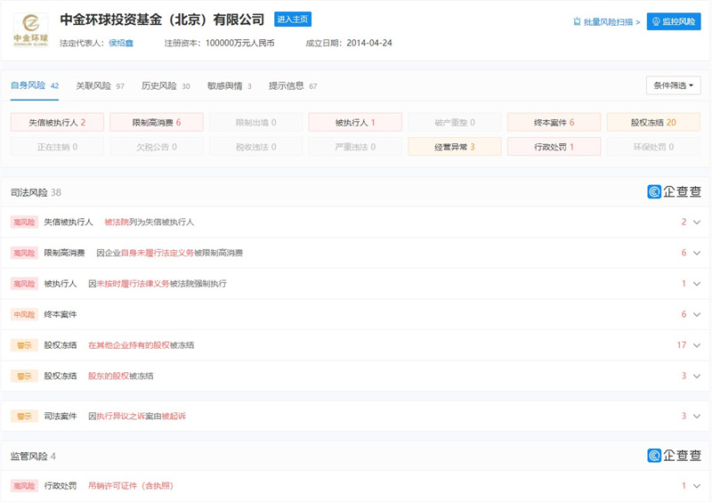 值得注意的是,中金環(huán)球投資基金集團的主公司中金環(huán)球投資基金(北京)有限公司曾因執(zhí)行異議之訴案由被起訴3次;因未按時履行法律義務被法院強制執(zhí)行1次;因企業(yè)自身未履行法定義務被限制高消費6次;因違反《中華人民共和國公司登記管理條例》(2016)第六十七條被行政處罰,吊銷執(zhí)照(登記證);涉及6起終本案件,被法院列為了失信被執(zhí)行人,凍結股東股權盒其他企業(yè)持有股權(其中就包含北京福安華生物科技有限公司)。