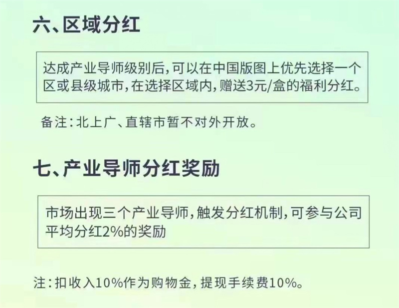 區(qū)域分紅獎勵:達成產(chǎn)業(yè)導師級別后,可以在中國版圖上優(yōu)先選擇一個區(qū)或縣級城市(除北上廣、直轄市以外),在選擇區(qū)域內,每銷售一盒產(chǎn)品,都可以獲得3元/盒的福利分紅。
