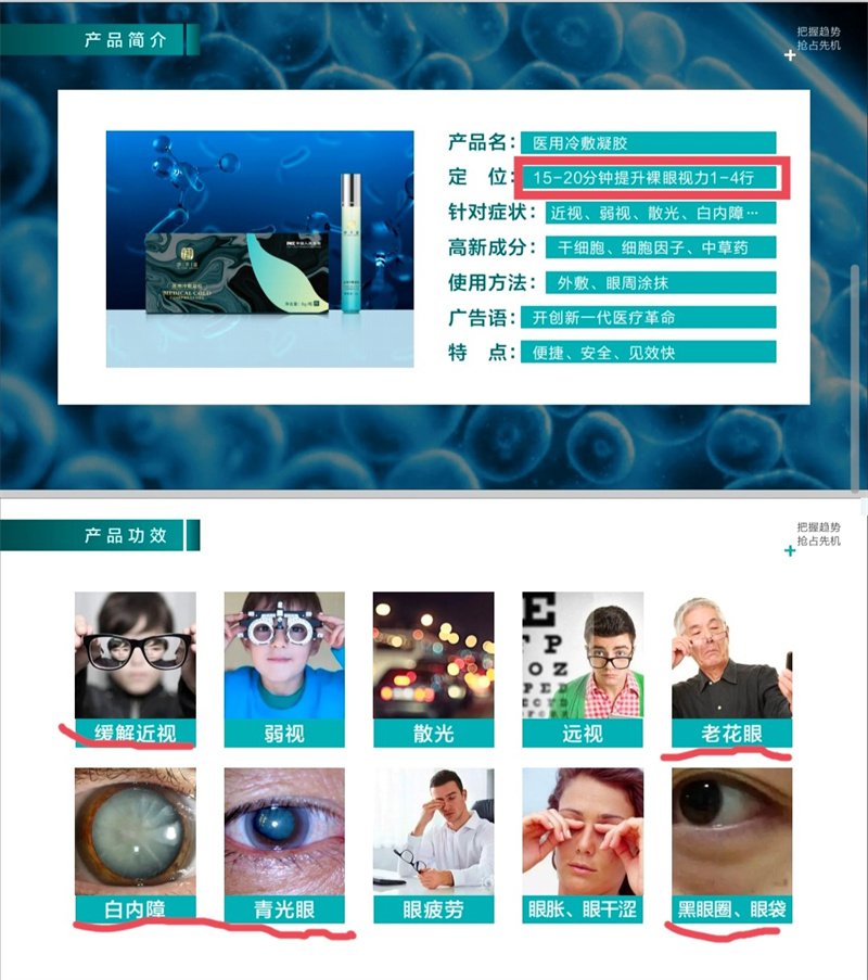 “御京盛·醫(yī)用冷敷凝膠”是住邦生物科技旗下的產(chǎn)品,其代理宣傳到,該產(chǎn)品只需要涂抹在眼周,便可以輕松調理近視、弱視、散光,祛除黑眼圈和眼部細紋,還可以治療飛蚊癥、青光眼、白內障等眼部疾病。