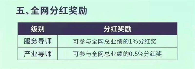 產(chǎn)業(yè)導師分紅獎勵:達成產(chǎn)業(yè)導師級別后,團隊中出現(xiàn)三個產(chǎn)業(yè)導師,就可觸發(fā)分紅機制,可參與公司總業(yè)績2%的平均分紅獎勵。