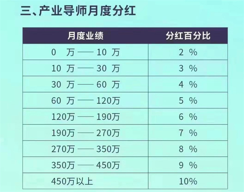 團隊業(yè)績分紅獎勵:產(chǎn)業(yè)導師的團隊月總業(yè)績在0~10萬之間,可獲得團隊月總業(yè)績2%的分紅;團隊月總業(yè)績在10~30萬之間,可獲得團隊月總業(yè)績3%的分紅;團隊月總業(yè)績在30~60萬之間,可獲得團隊月總業(yè)績4%的分紅;團隊月總業(yè)績在60~120萬之間,可獲得團隊月總業(yè)績5%的分紅;團隊月總業(yè)績在120~190萬之間,可獲得團隊月總業(yè)績6%的分紅;團隊月總業(yè)績在190~270萬之間,可獲得團隊月總業(yè)績7%的分紅;團隊月總業(yè)績在270~350萬之間,可獲得團隊月總業(yè)績8%的分紅;團隊月總業(yè)績在350~450萬之間,可獲得團隊月總業(yè)績9%的分紅;團隊月總業(yè)績超過450萬,可獲得團隊月總業(yè)績10%的分紅。