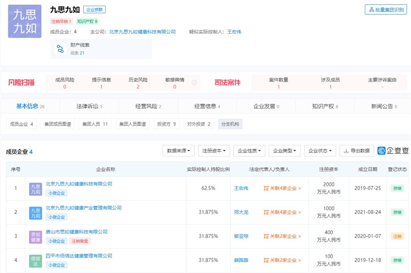 九思九如集團旗下共有四個公司,分別是北京九思九如健康科技有限公司、北京九思九如健康產(chǎn)業(yè)管理有限公司、唐山市思如健康科技有限公司(該公司已注銷)、四平市佰信達健康管理有限公司。其中,北京九思九如健康科技有限公司是九思九如集團的主體公司。