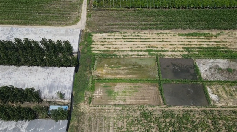 調(diào)查員7日到亓家莊村實(shí)地調(diào)查,在村民指引下來到養(yǎng)鴨場,這個(gè)養(yǎng)鴨場占地20多畝左右,有六個(gè)大型養(yǎng)殖棚。在養(yǎng)鴨場東側(cè)的農(nóng)田里,靠近就聞到陣陣臭味,地壟上長著雜草,地里黑臭寸草不生,沉積著鴨毛等垃圾,踩上去很軟,村民說這是糞水淹過后曬的。沿地壟向東走,看到還沒滲下去的黑臭糞水。再向南還有幾個(gè)大坑,滿滿的黑臭糞水,從養(yǎng)鴨場伸出的一根粗塑料管子通向大坑,坑邊種著部分玉米,從遠(yuǎn)處看大坑被玉米擋得很嚴(yán)實(shí),但陣陣臭味還是出賣了它們的存在。排放糞水的農(nóng)田大約在十幾畝地左右,村民說這地就白白浪費(fèi)了,種上糧食多好。